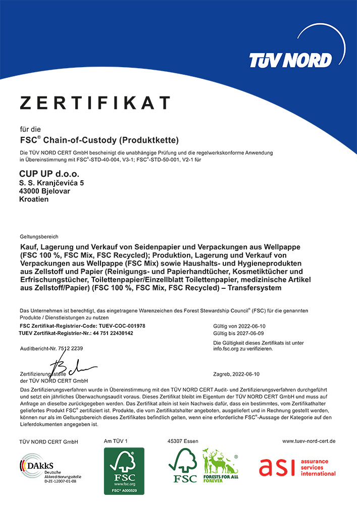 ISO 9001 ist der internationale Standard, der Anforderungen an ein Qualitätsmanagementsystem (QMS) festlegt. Unter ISO 9001:215 hat CUP UP die Fähigkeit nachgewiesen, durchgängig Produkte und Dienstleistungen bereitzustellen, die die Kundenzufriedenheit und die gesetzlichen Anforderungen erfüllen.